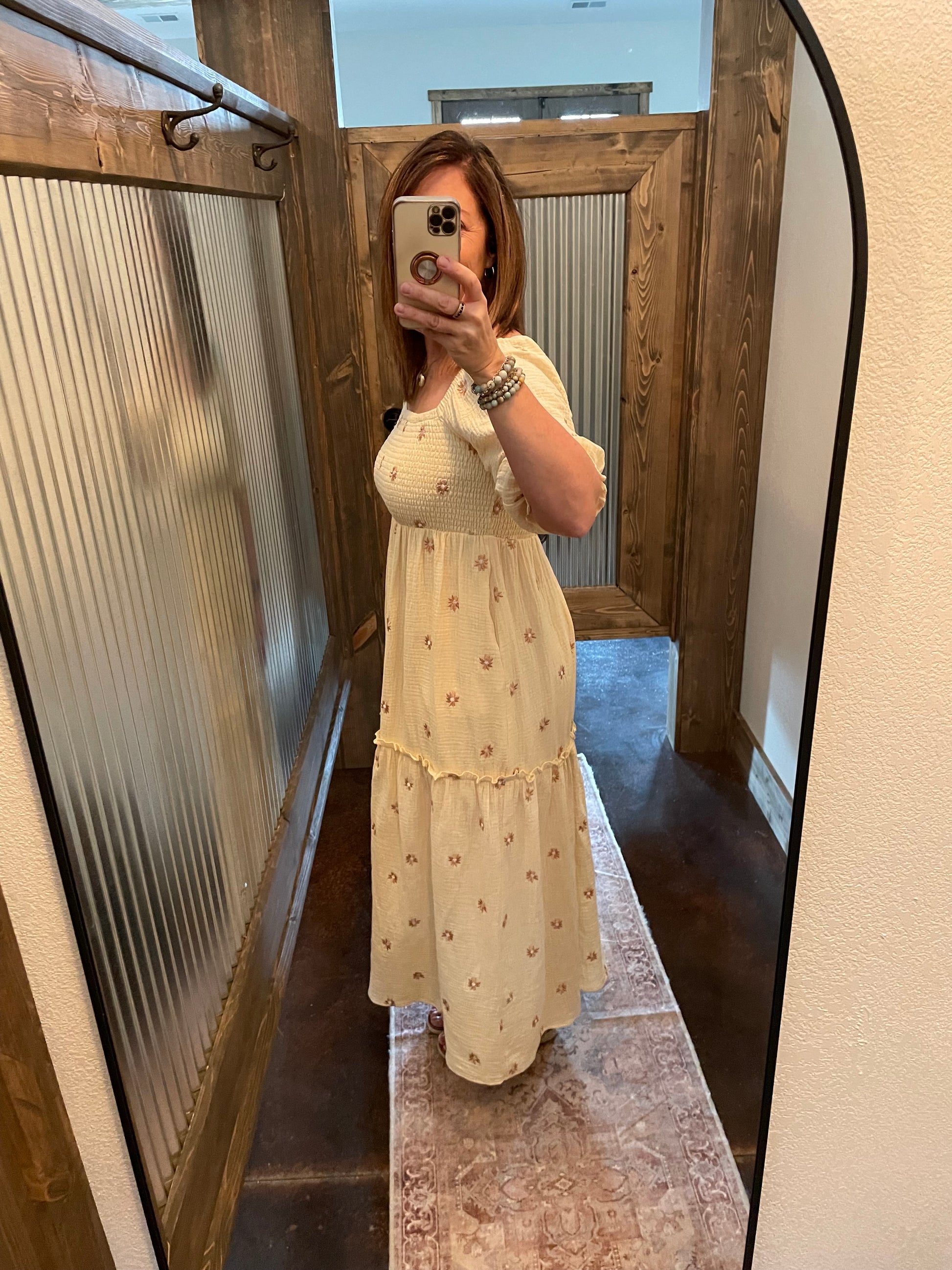 Women's floral embroidered smocked top tiered maxi dress. Half sleeve with a comfortable elastic ruffle cuff. Bottom is lined to the ruffle. Has pockets. Flowy fit.