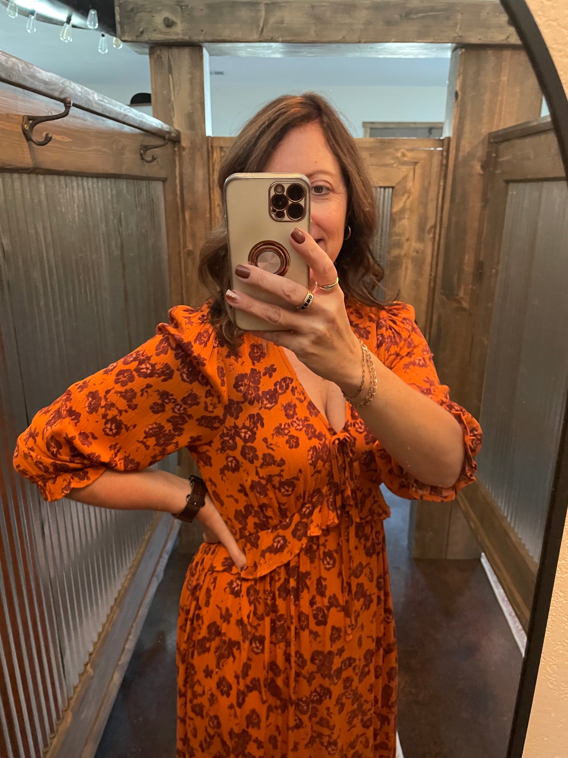 * V-NECK * FLORAL PRINT * 3/4 PUFF SLEEVES * TIMELESS ELEGANCE * ELASTIC BAND AT THE WAISTLINE * SHIRRED WAIST * MIDI LENGTH * DRESS * FLATTERING * TIERED SKIRT