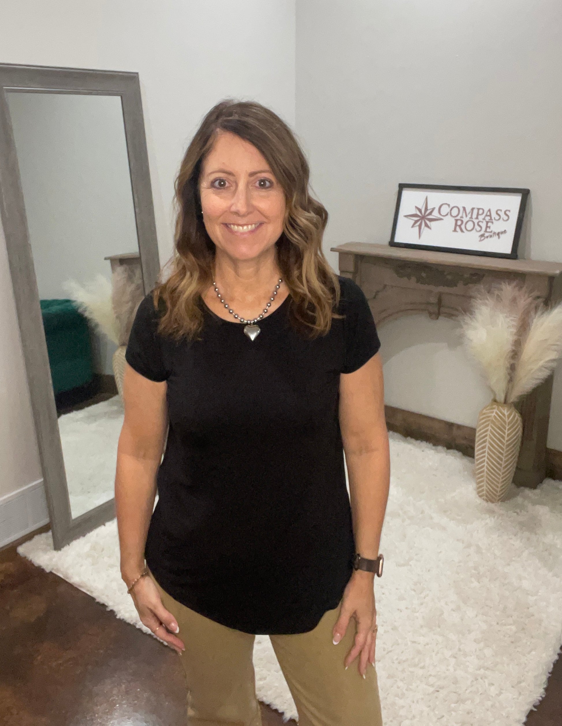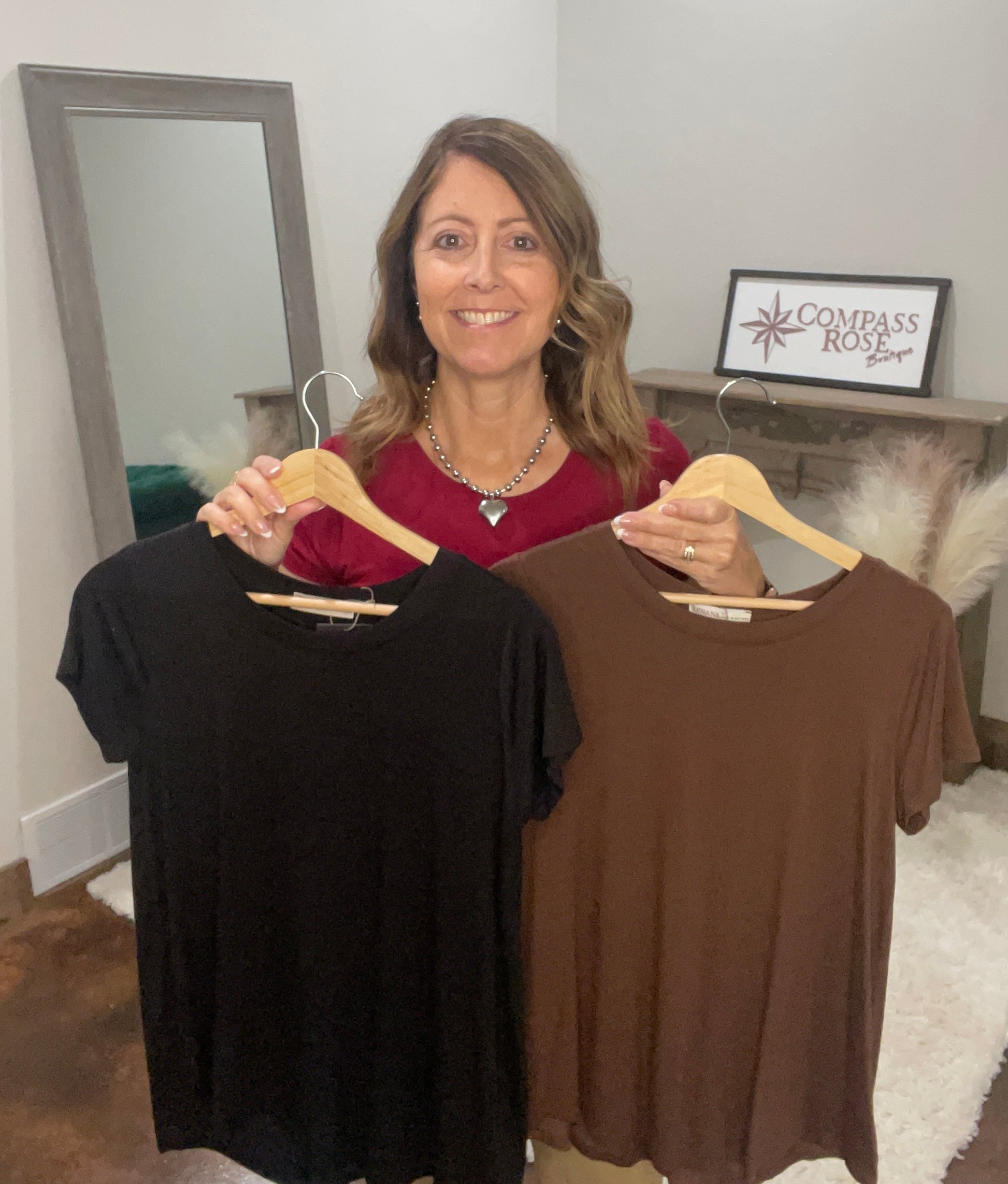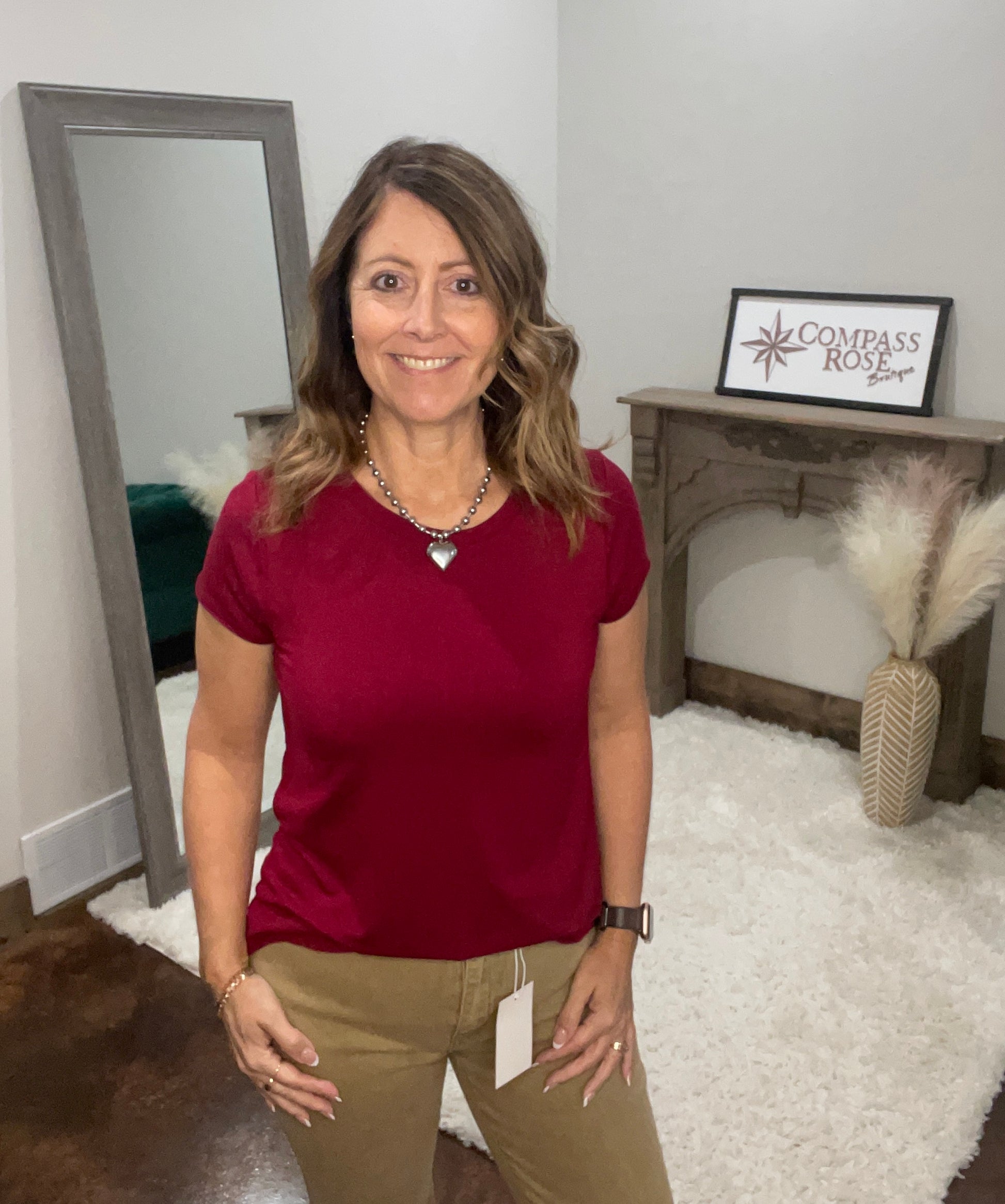 Relaxed fit. Total body length: 25.5" (front), bust: 35" approx measured from small. Fabric: 95% rayon, 5% spandex.