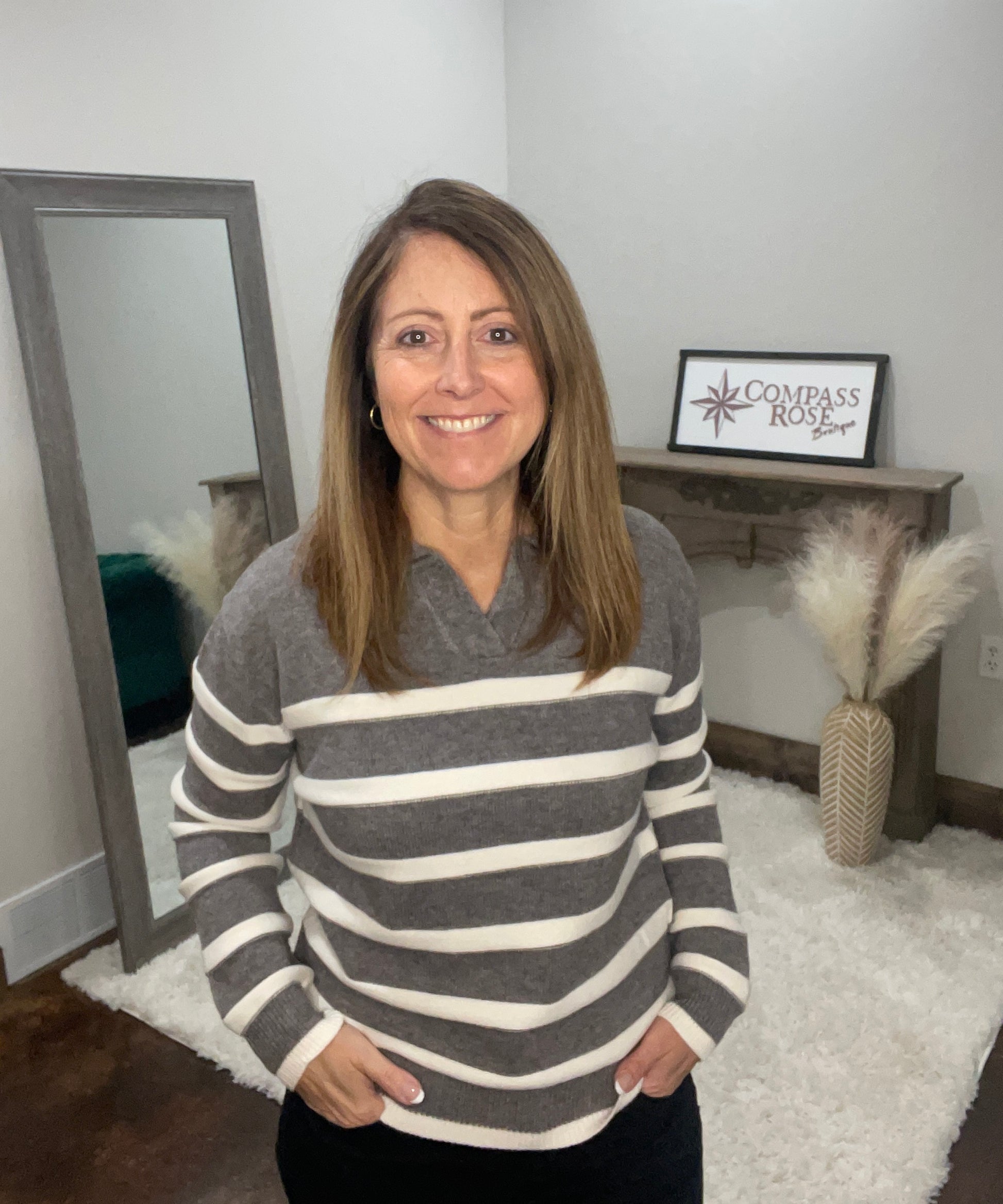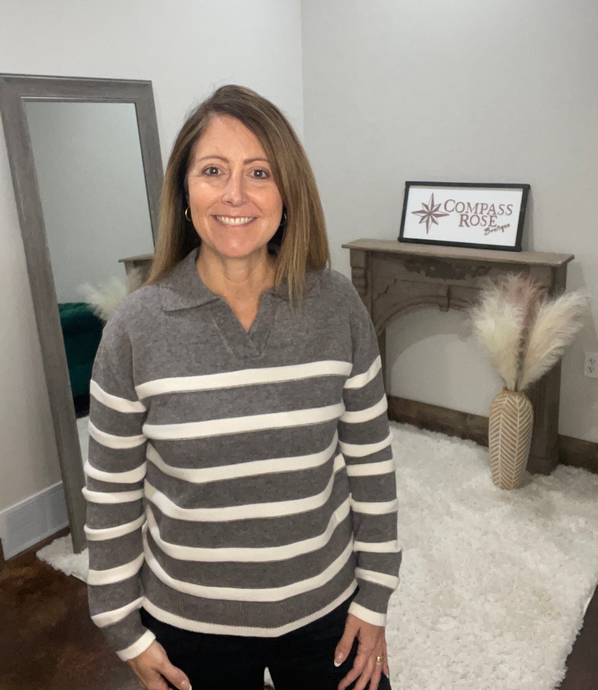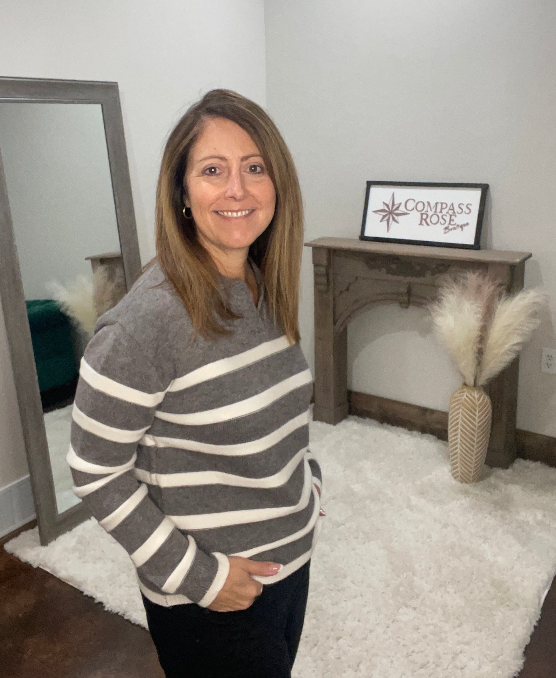 Split V-neck Polo Neckline Striped Sweater Top - Split V-neck polo neckline for a modern, casual look - Horizontal stripe pattern adds a classic, sporty touch - Long sleeves with ribbed cuffs for comfort and warmth - Soft knit fabric provides all-day comfort STYLE MEASUREMENTS (SIZE SMALL) -Total Length 23 1/2" -Bust 20" -Shoulder 18" -Sleeve Length 23" 50%VISCOSE 28%POLYESTER 22%NYLON MODEL IS 5'9" | BUST 32" | WAIST 25"