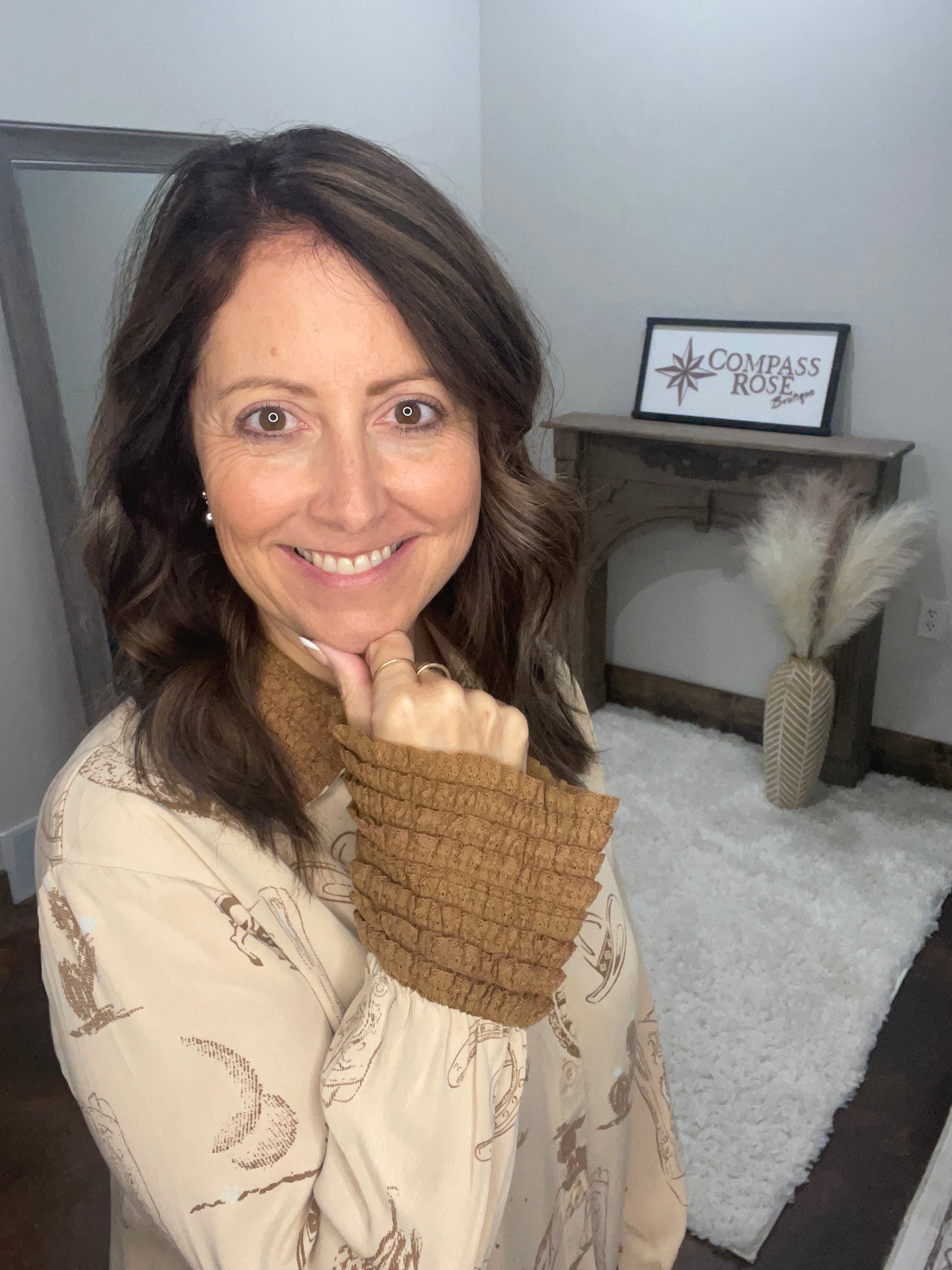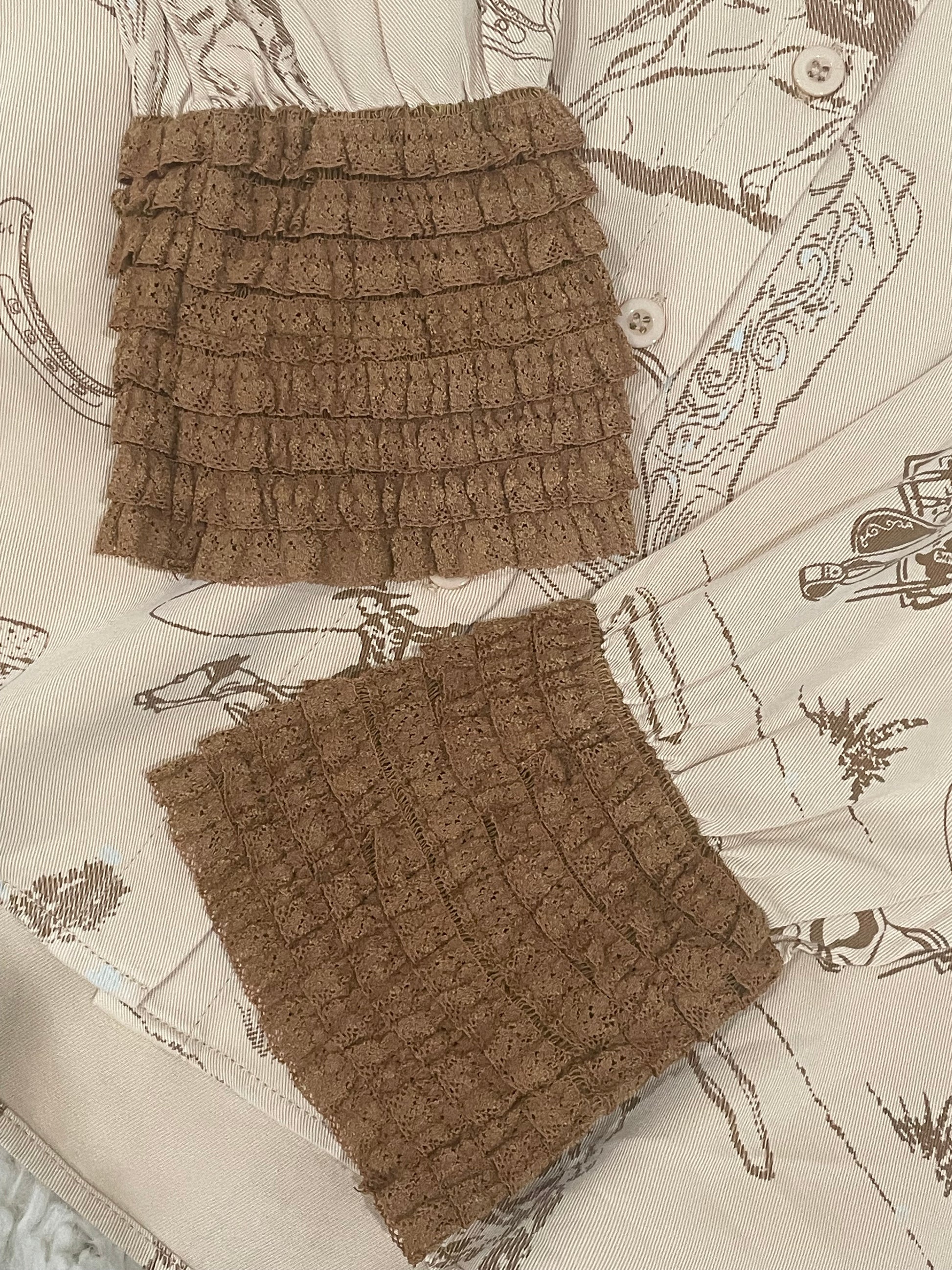 Button down shirt with western-style illustrations, gathered contrast ruffle cuffs, and a relaxed fit for a soft prairie-inspired look 100% Tencel